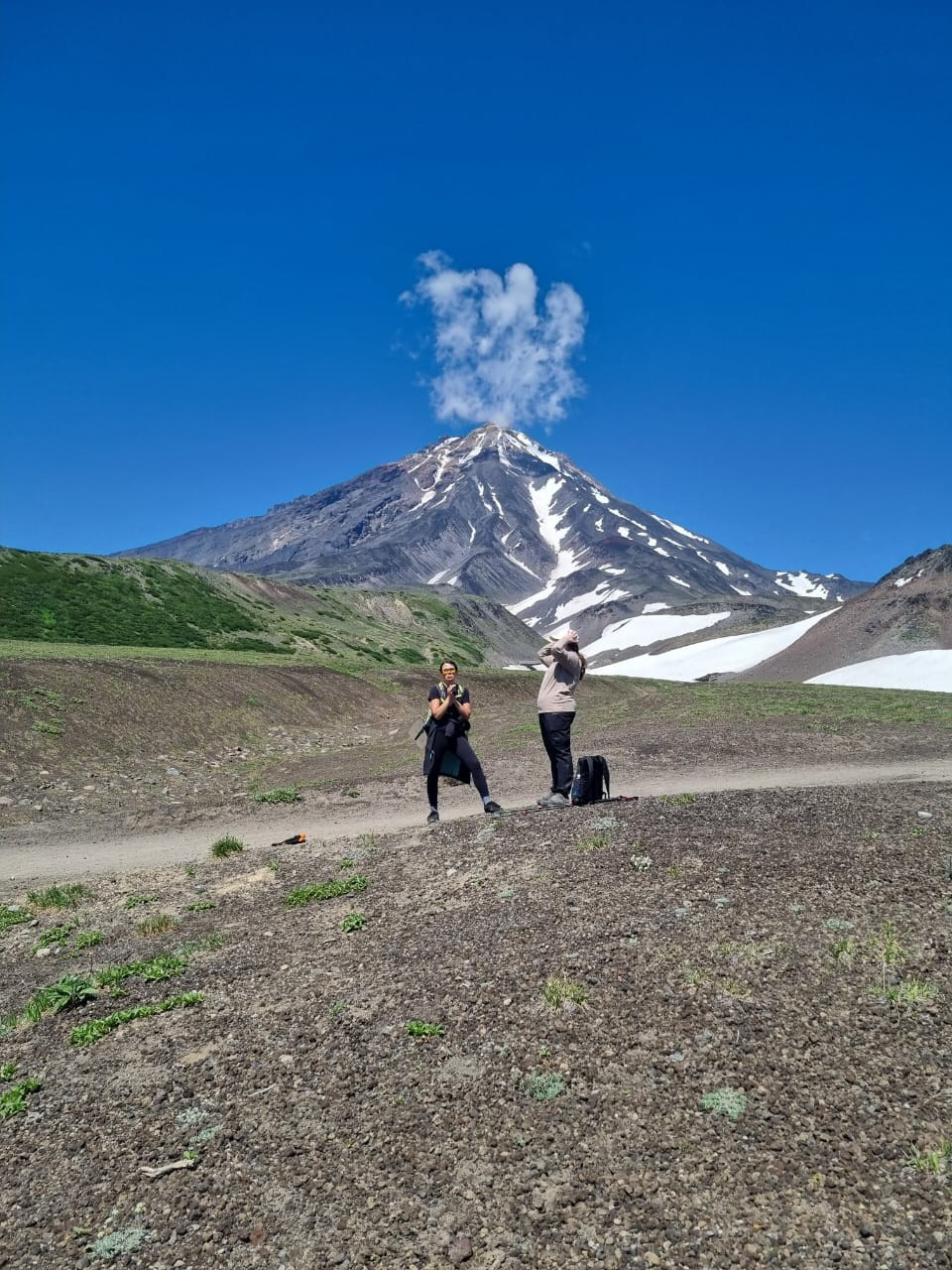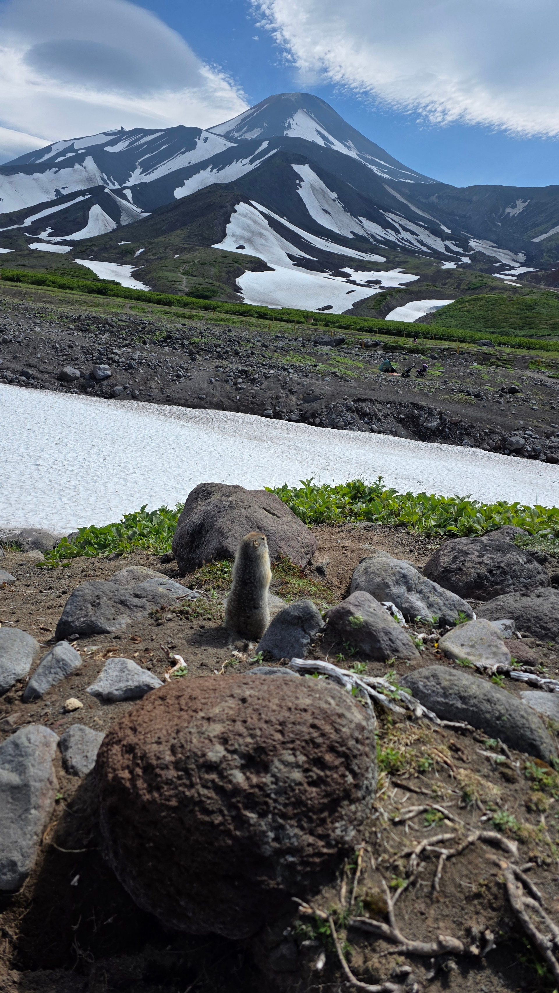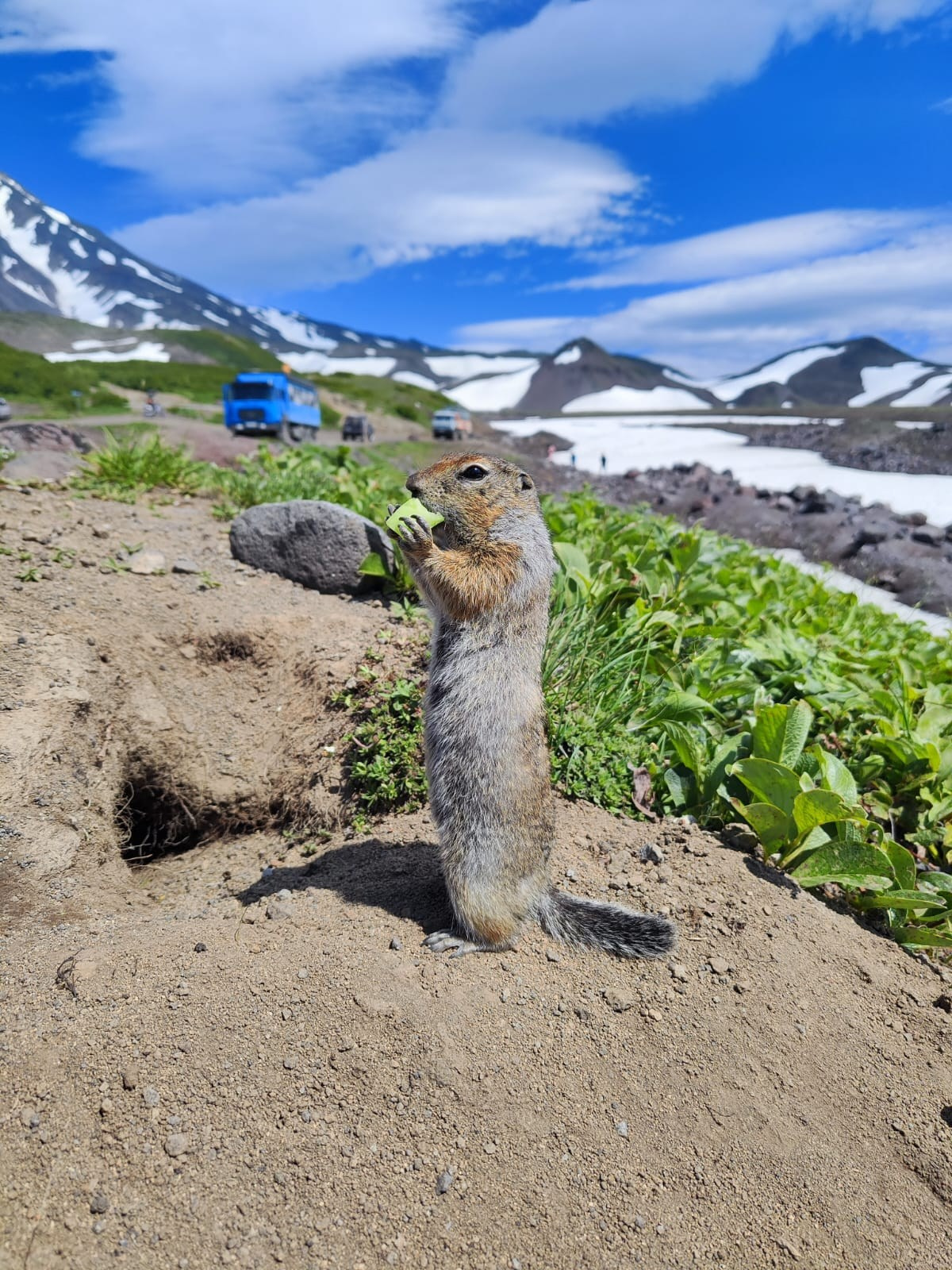 Наше приключение начнется с путешествия на внедорожнике по руслу «сухой речки», время в пути зависит от количества воды и снега в русле (1,5-2 часа). Прибытие к Авачинскому перевалу на высоту около 1200 метров над уровнем моря. После этого вас ждет небольшое восхождение (30-40 минут) на гору Верблюд (результат вулканической деятельности вулкана Авачинский), где вы не только изучите вулканические породы, насладитесь красотой множества альпийских цветов, но и встретите берингийских сусликов (евражек), которые с радостью позируют перед объективами камер. После спуска вы сможете сделать перерыв и подкрепиться на свежем воздухе, с захватывающими панорамами действующих вулканов