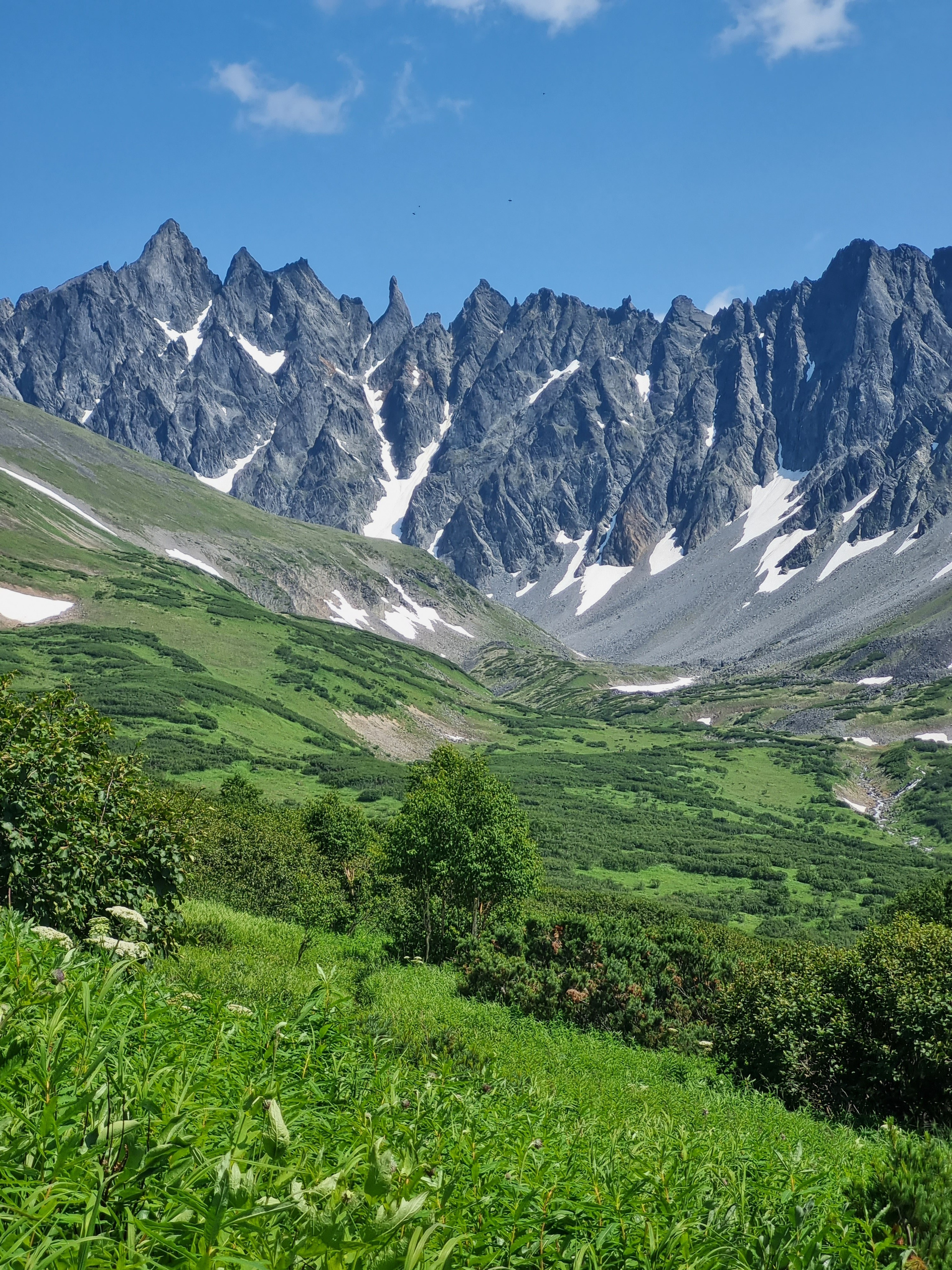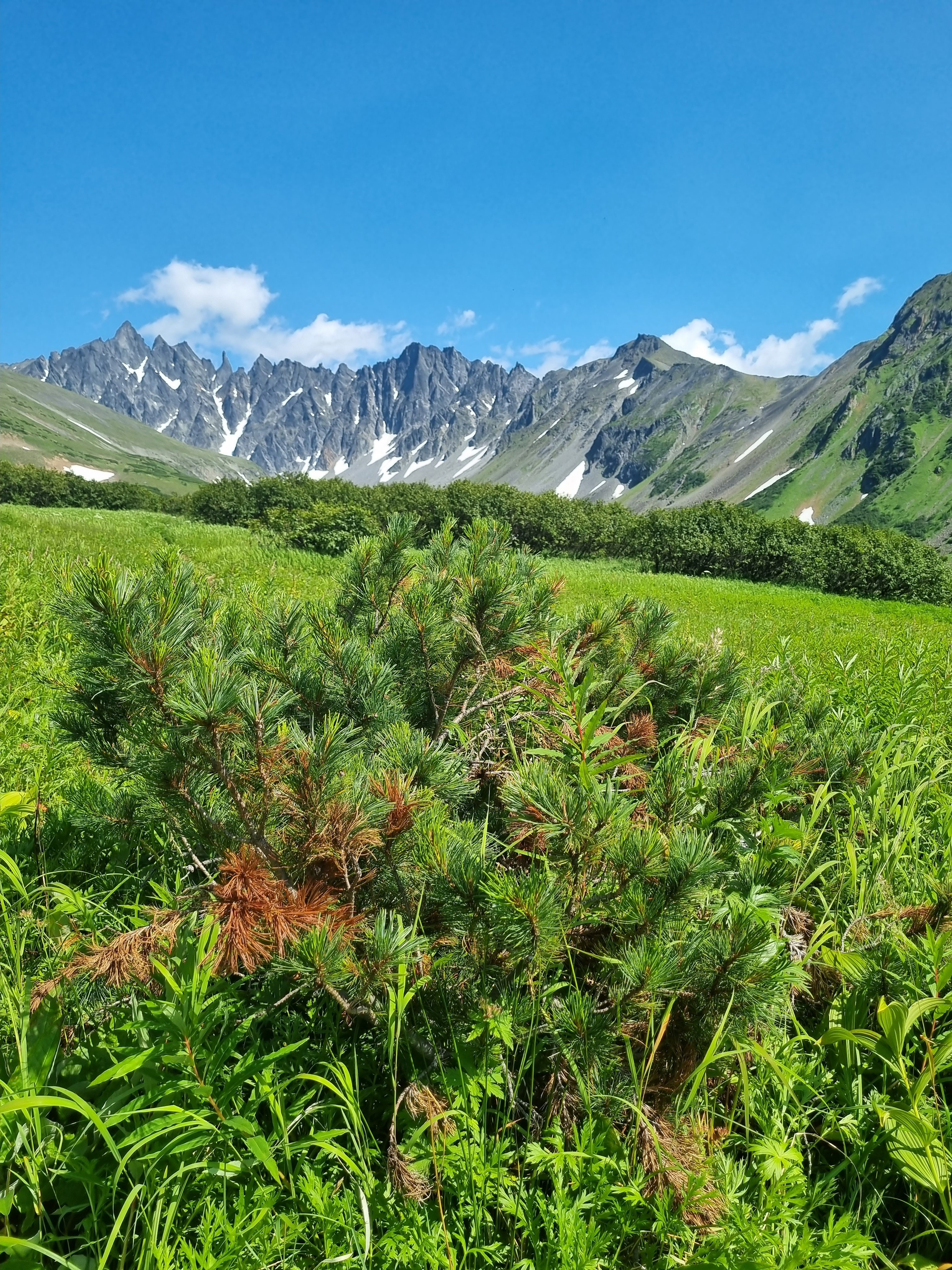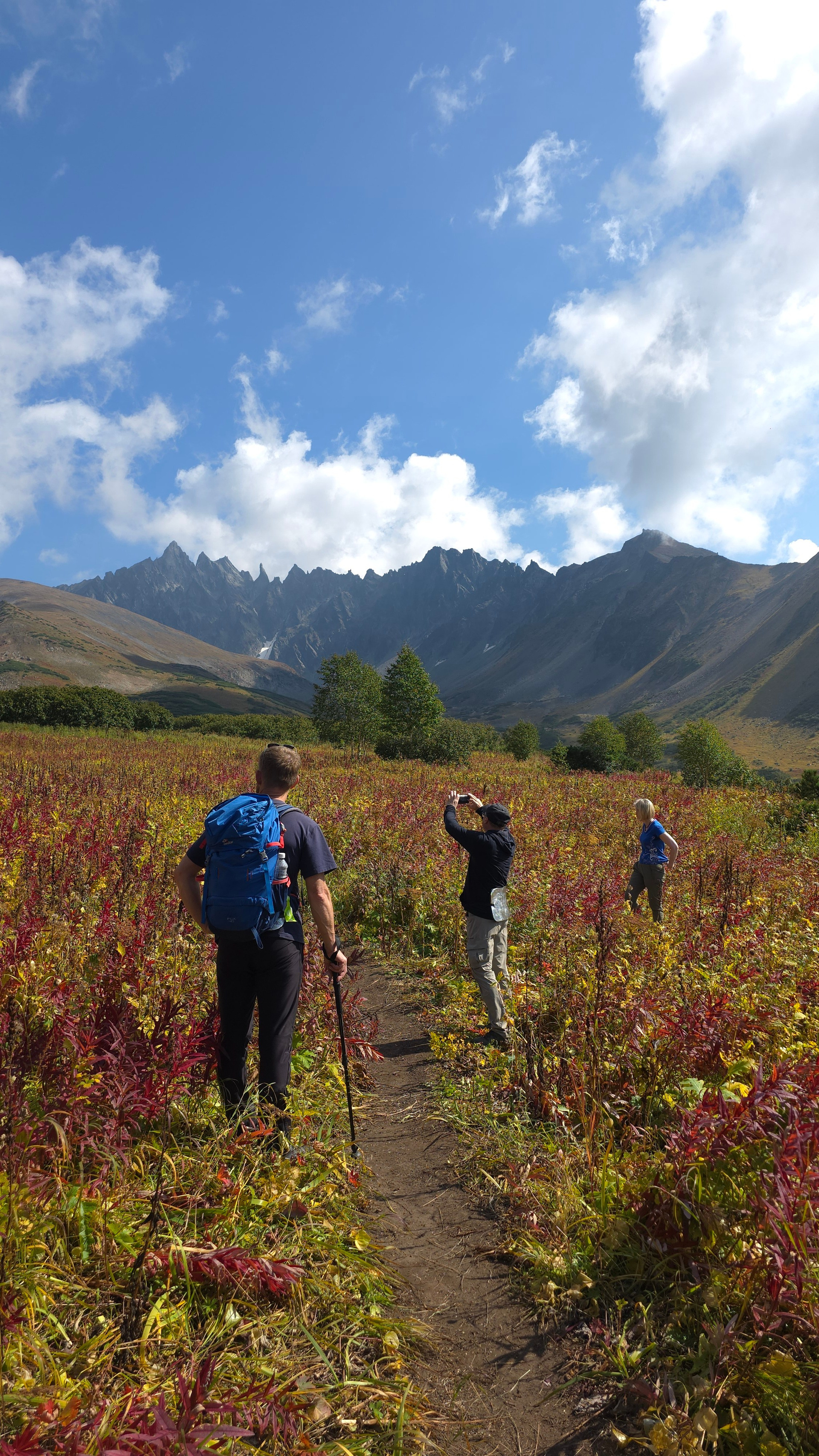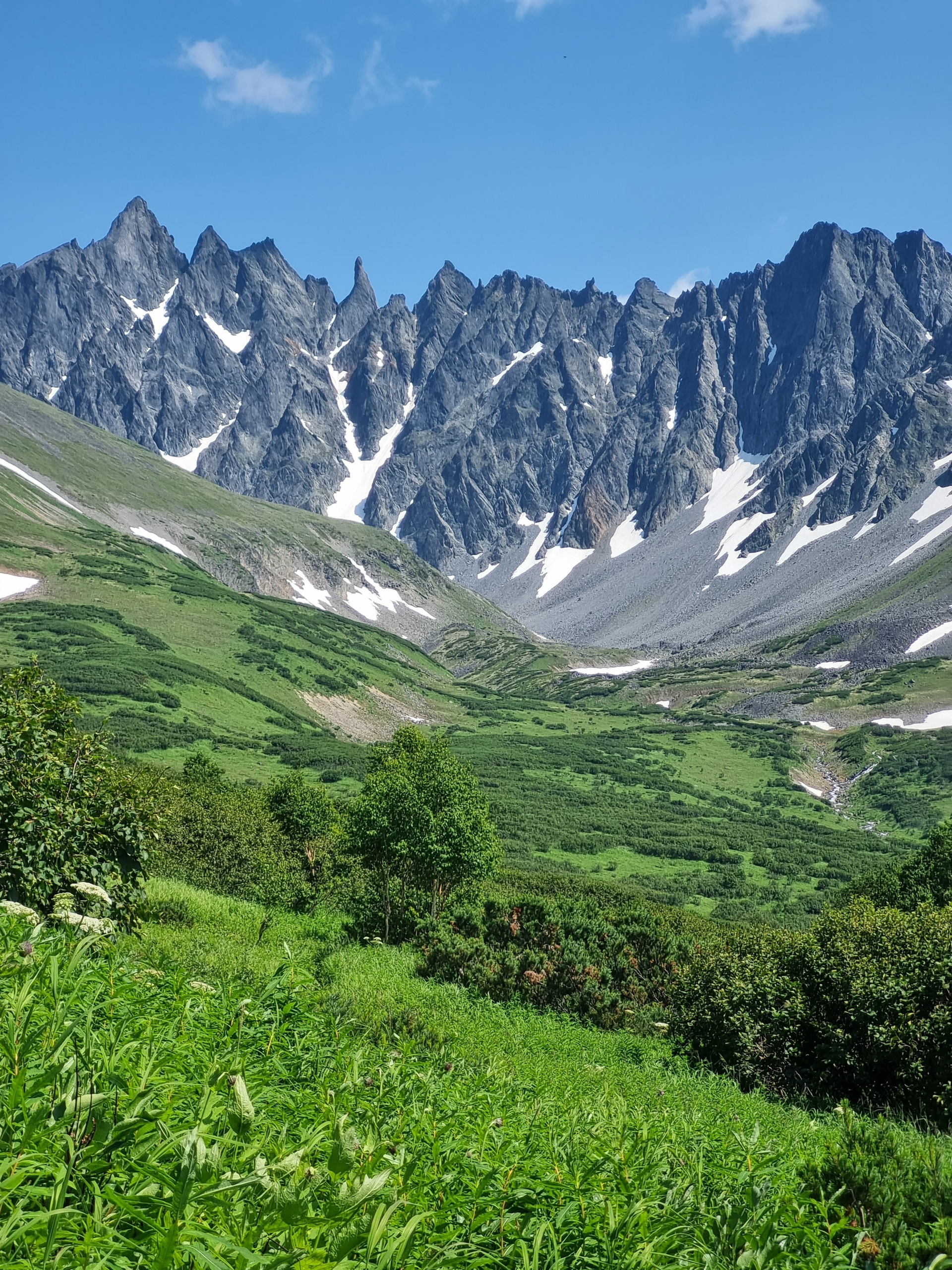В этом заповедном углу Земли можно наблюдать природу, которая совершенно не похожа на ту вулканическую красоту, с которой мы привыкли ассоциировать Камчатку. Вместо величественных вулканов, поднимающихся к облакам, здесь раскинулись готические пики, словно вырезанные из камня, которые придают этому месту неповторимый и загадочный облик. Вместо привычного сыпучего шлака, характерного для вулканических ландшафтов, взору открывается мягкая горная тундра, покрытая нежными мхами и яркими цветами, которые создают контраст с суровыми скалами.